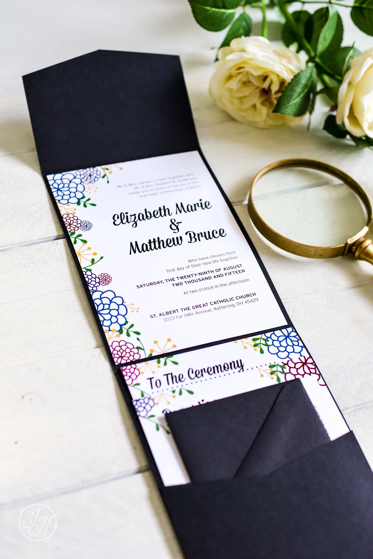 Okay so there are a few more colors than just the primary three, but you get the gist! This Ivory Bride came to me at the beginning of the year with a floral, multi-colored theme in mind and no idea how to execute. Her theme was black with a variety of "primary" colors, which we incorporated throughout the floral patterning. And to keep it easy for guests we packaged everything up (invitations, direction cards, reception details and RSVP) in a nice little, convenient pocket folder! I am so thankful I was able to create this custom suite! It turned out lovely and was the perfect announcement for Elizabeth and Matthew's modern, colorful nuptials!