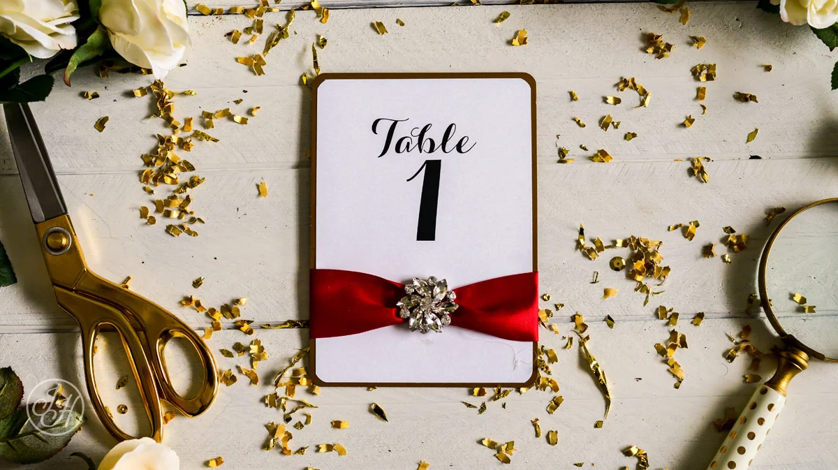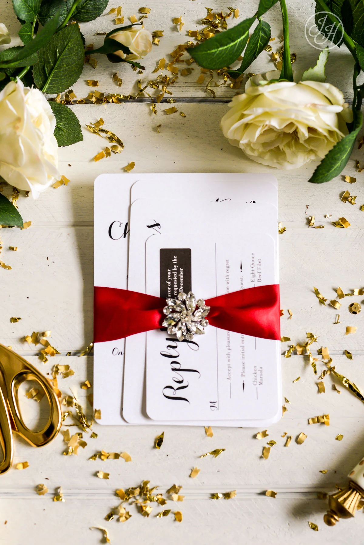 With the holidays upon us I thought this would be the perfect time to share this lovely winter wedding with you! To start Christine and David's stationery journey we went with a holiday themed Save the Date postcard that embodied the spirit of their big day! Let's just say hearts weren't the only thing glowing on this lovely day. Think large wintery pines and sprawling christmas florals throughout the entire event. To compliment the decadent decor the lovely couple chose a simple, yet eye catching invitation suite using red satin ribbon and a brooch that was to die for! We wrapped these lovely paper pieces in a shimmery, white stationery box, accompanied with gold tissue paper. These invitations were like a present themselves. I would have been ecstatic to get one in my mailbox!