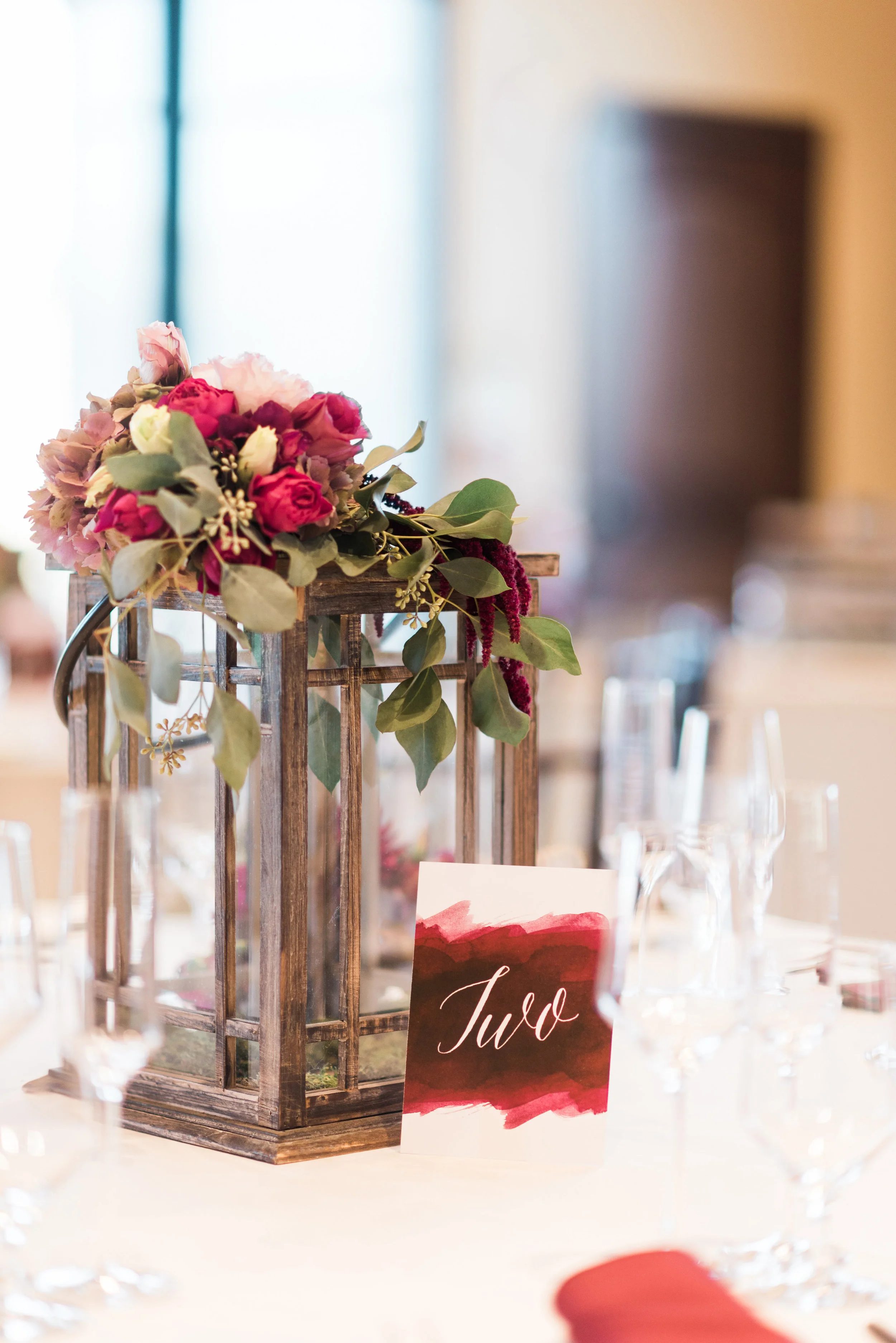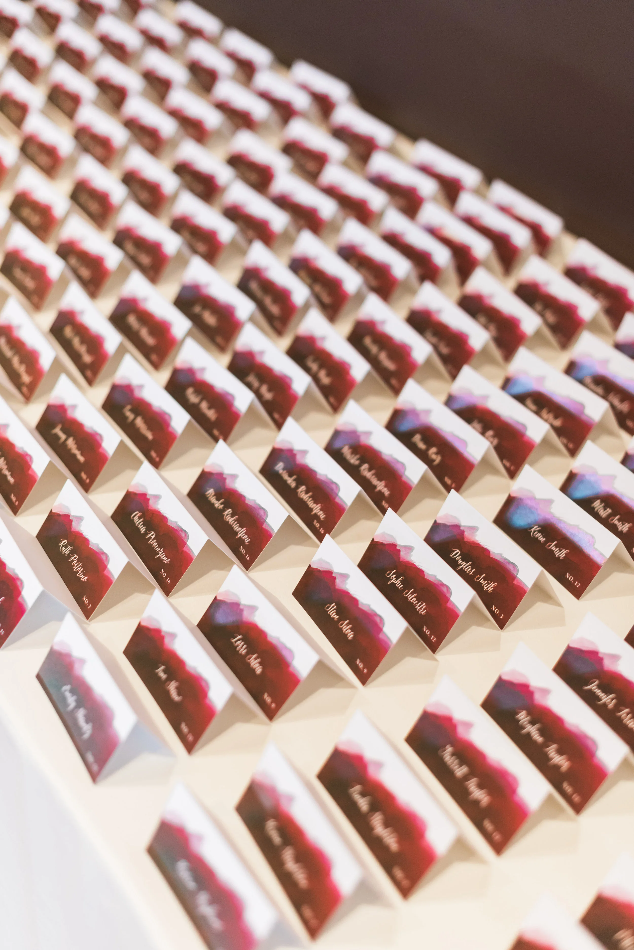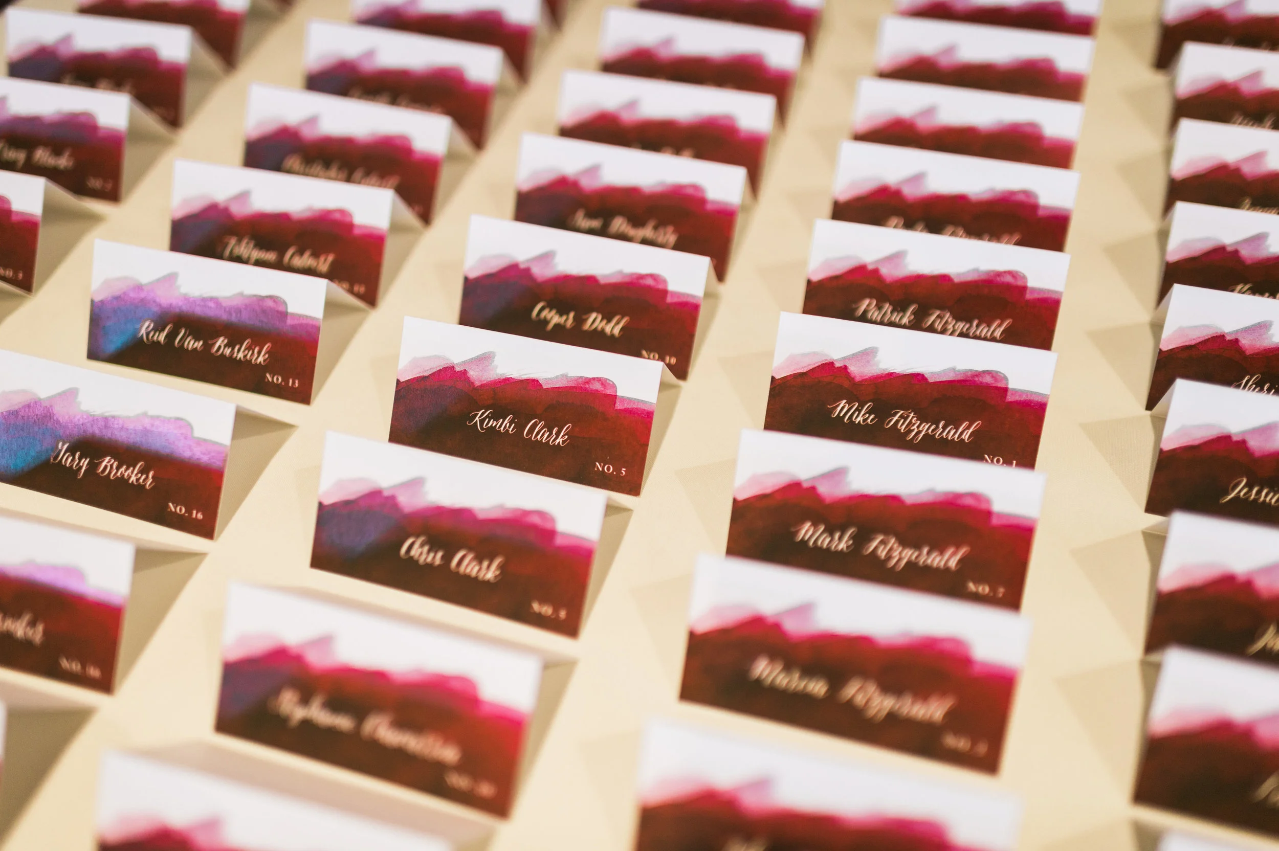 Lianne came to me wanting to use a burgundy/wine watercolor texture in all of her paper pieces to coordinate with her California winery wedding. We worked together to create an invitation suite, tying in her gold accents by using gold envelopes and a striped cotton ribbon. For the reception we incorporated the watercolor texture throughout the table numbers and escort cards. How beautiful are these watercolor details? I just love how the table numbers pop with those florals. It is so great to see how everything turned out for Lianne and Eric's big day! Thanks so much for sharing and a big shout out to Vero Suh Photography for the lovely images.