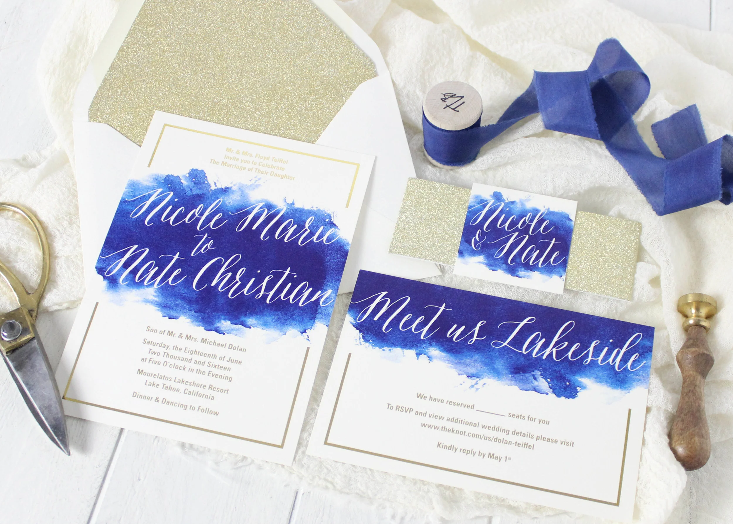 Inspired by a past feature on Wedding Chicks, Nicole and Nate wanted a watercolor invitation suite perfect for their Lake Tahoe wedding. Together we decided to pair a classic blue watercolor wash with elegant gold foil printing on a nice ivory paper stock. And for a little extra sparkle we used a gold glitter envelope liner and bellyband topped with a coordinating monogram tag.