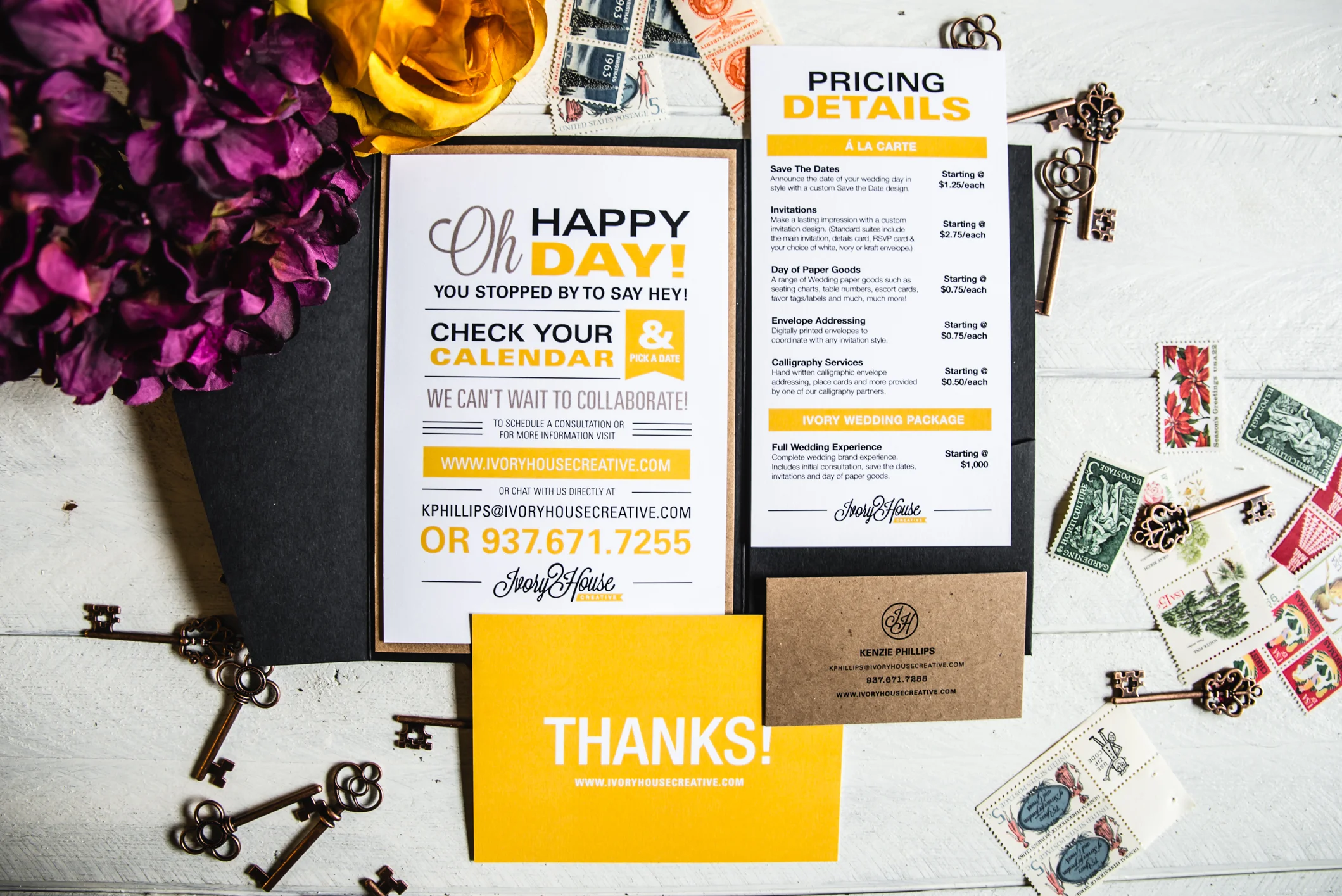 I have been meaning to blog about this for a while now, but better late than never I suppose! So, back in January we started out the New Year attending the Dayton Bridal Expo. This was our second time exhibiting, but our first time with our new booth! The first year we really just got our feet wet and only set up a couple tables with an easel sign, but this year we went all out! I am talking full wall backdrop, lighted display crates and lovely florals from Ivy Hutch Flowers. I had full intentions of snapping some quality booth photos but of course I completely forgot (womp, womp). I did however have my lovely photographer friend, Holly, capture some photos of our collateral that we handed out to prospective couples.