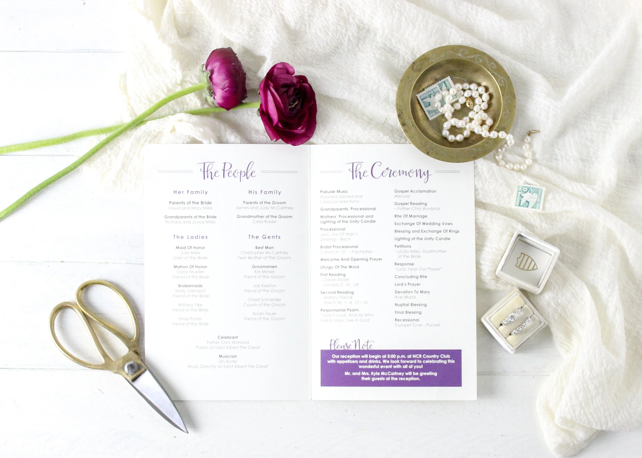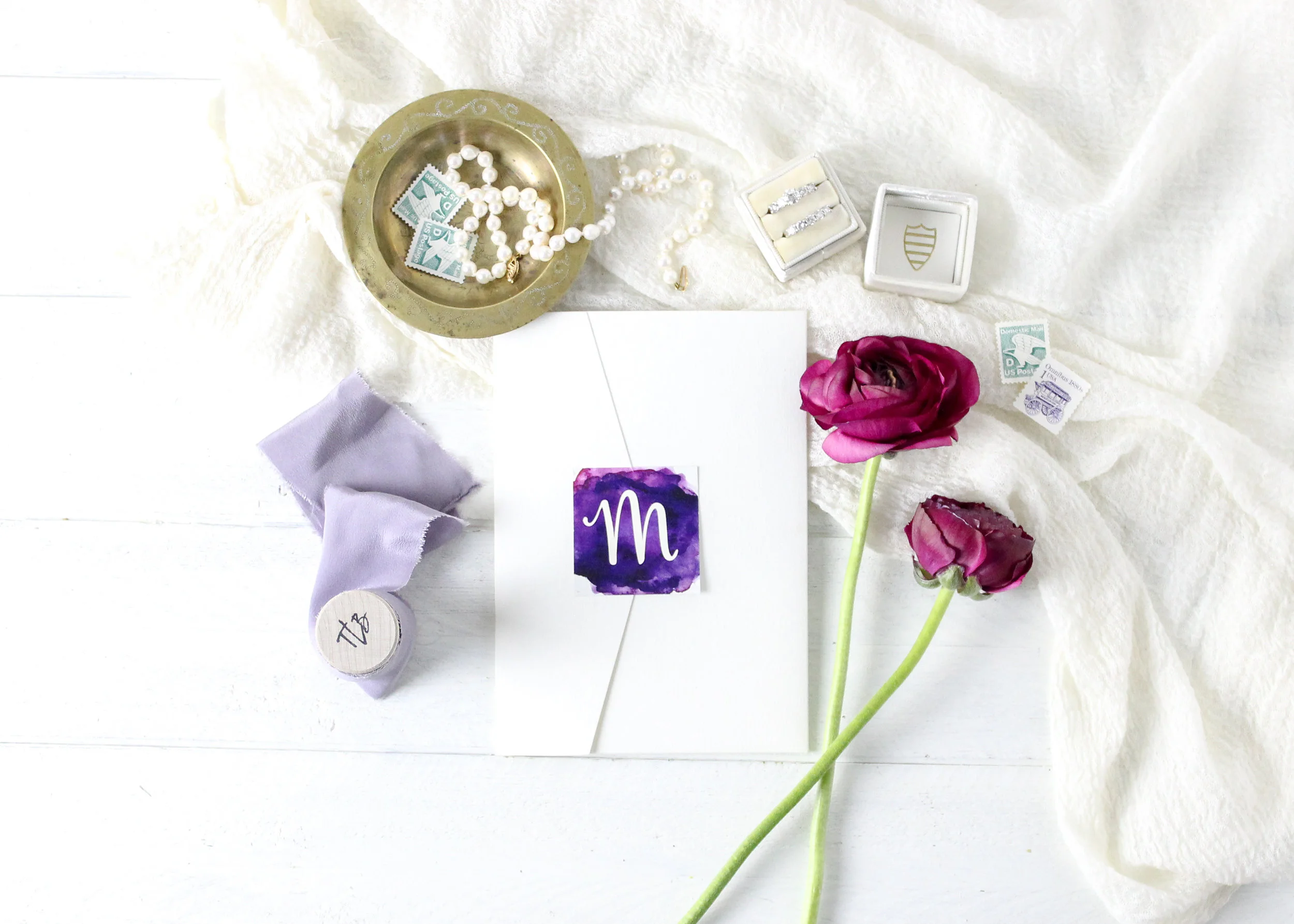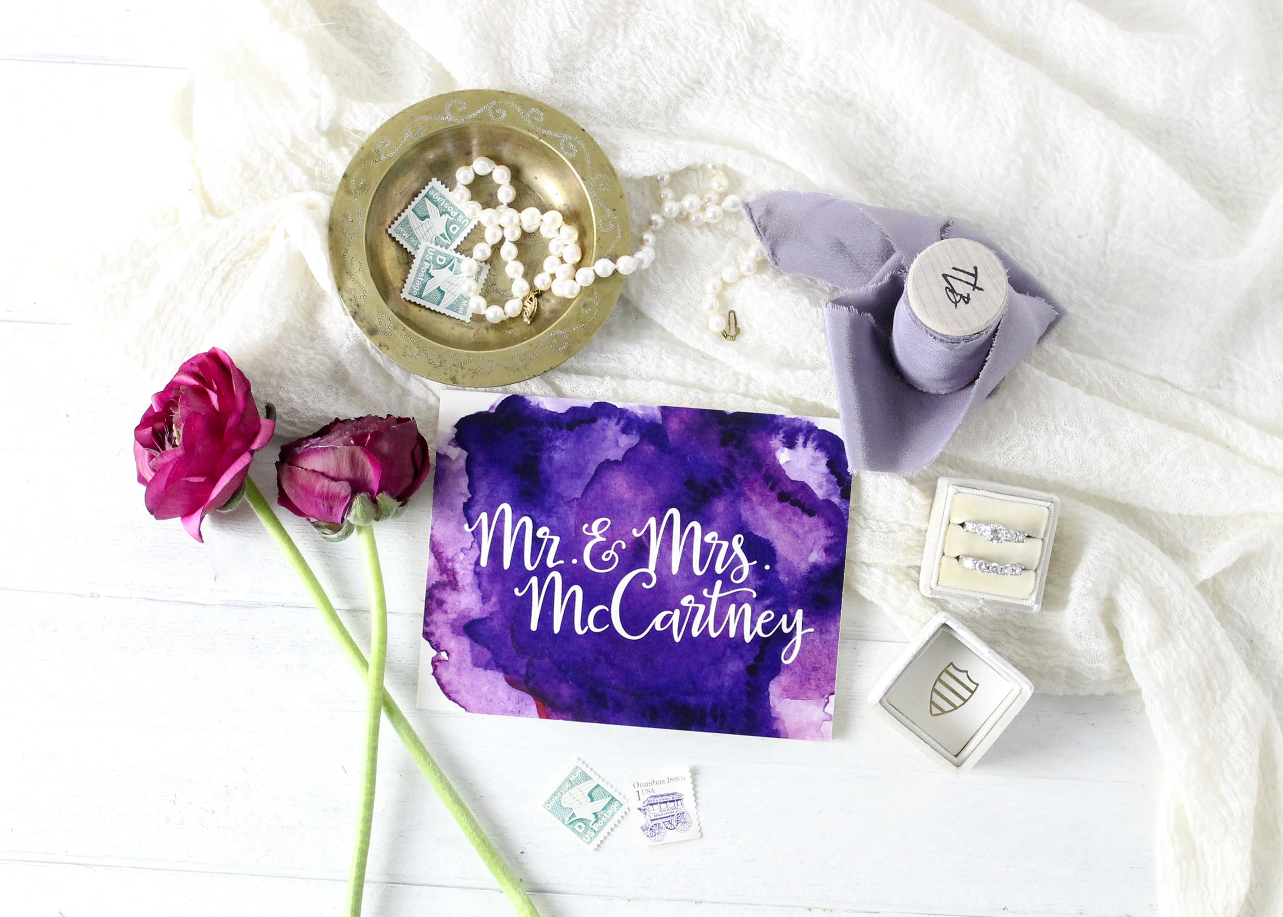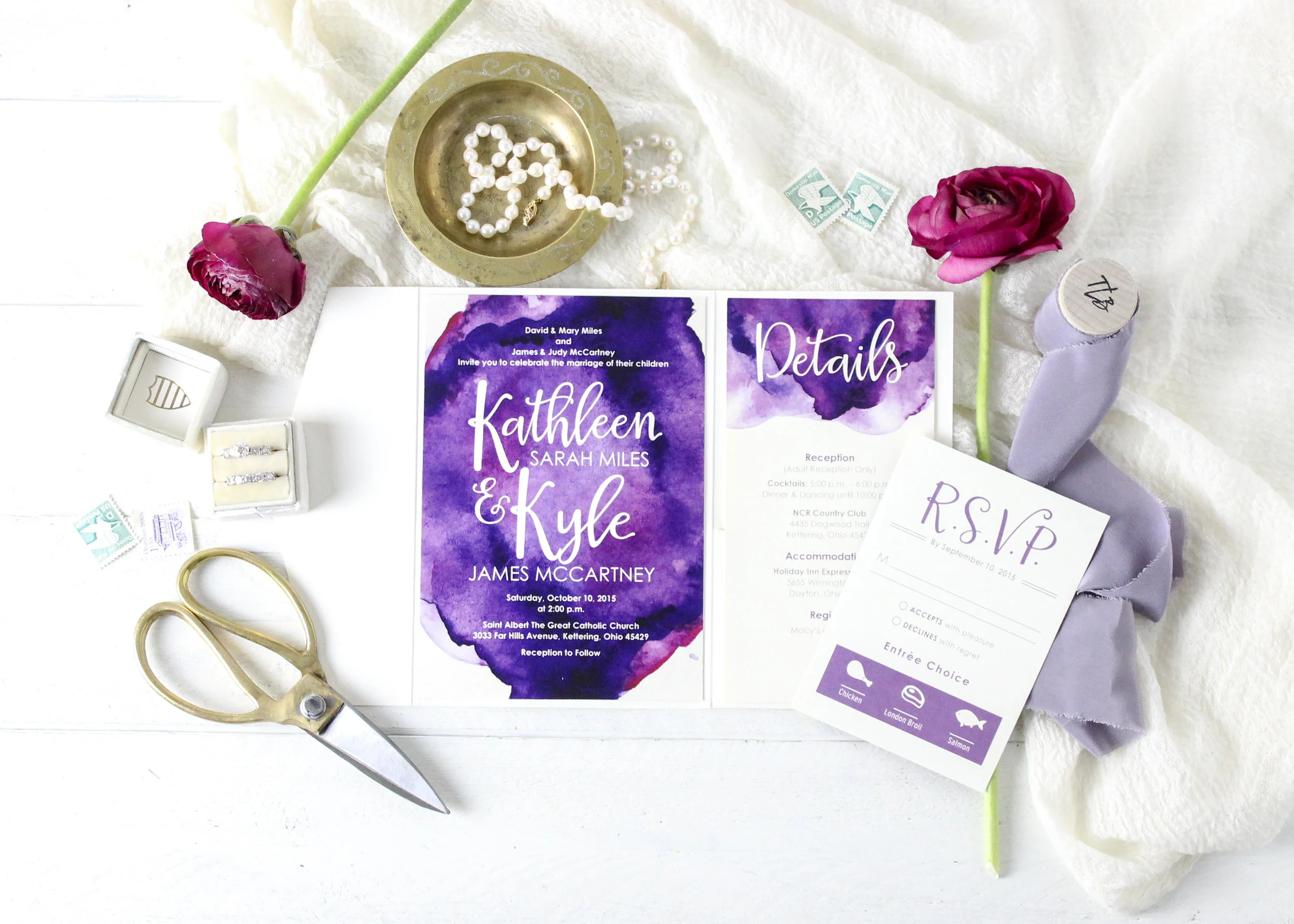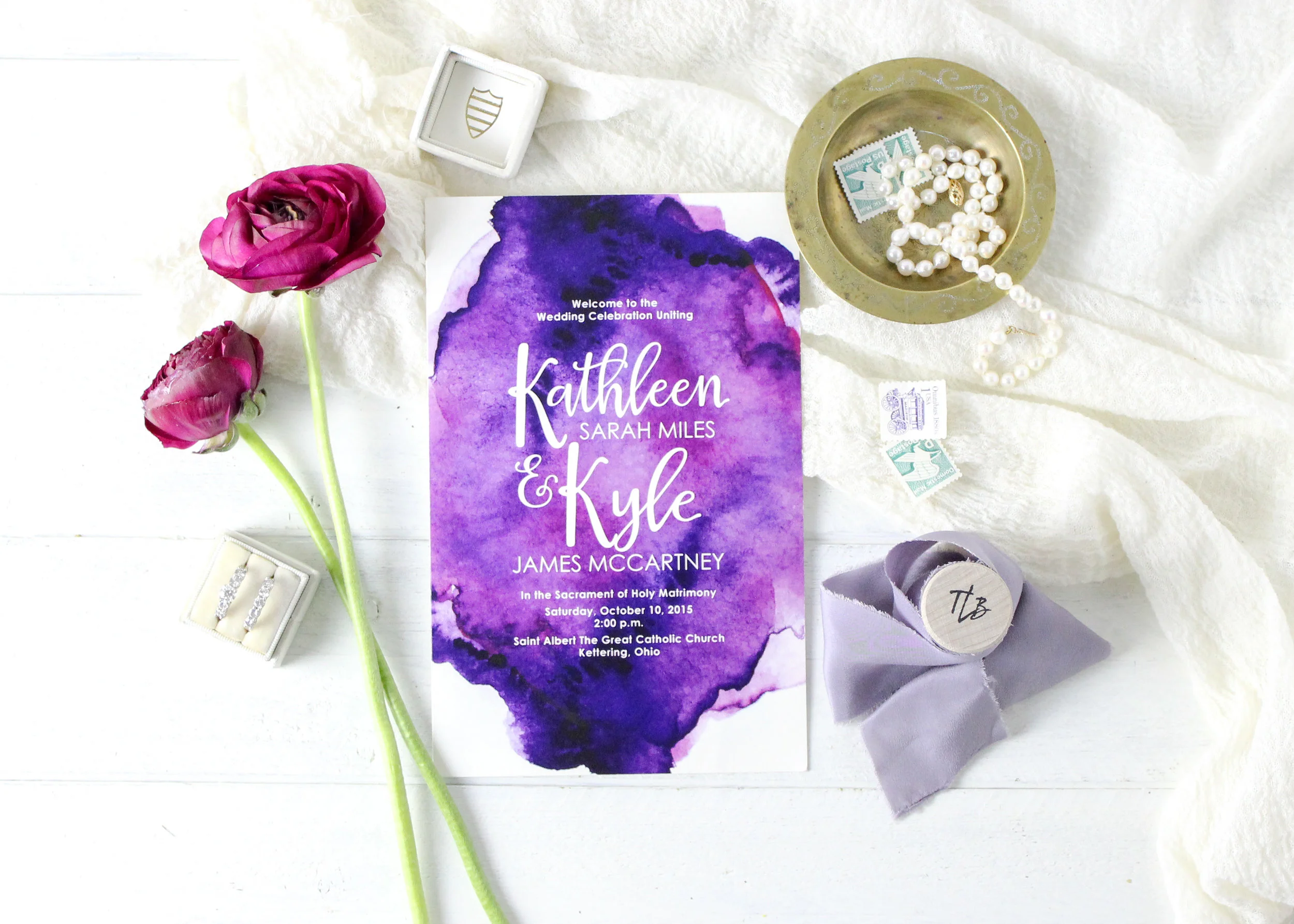 This lovely watercolor goodness was designed to incorporate Katie's vision of using various hues of purples throughout their wedding day. We decided to pair the invitation suite with a lovely ivory pocket folder and coordinating monogram sticker. To continue with the watercolor theme we also designed a host of paper goods including the ceremony programs, thank you cards and a large seating chart (not pictured). Katie and Kyle were a dream to work with and I loved coming up with such a vibrant and eye catching piece.