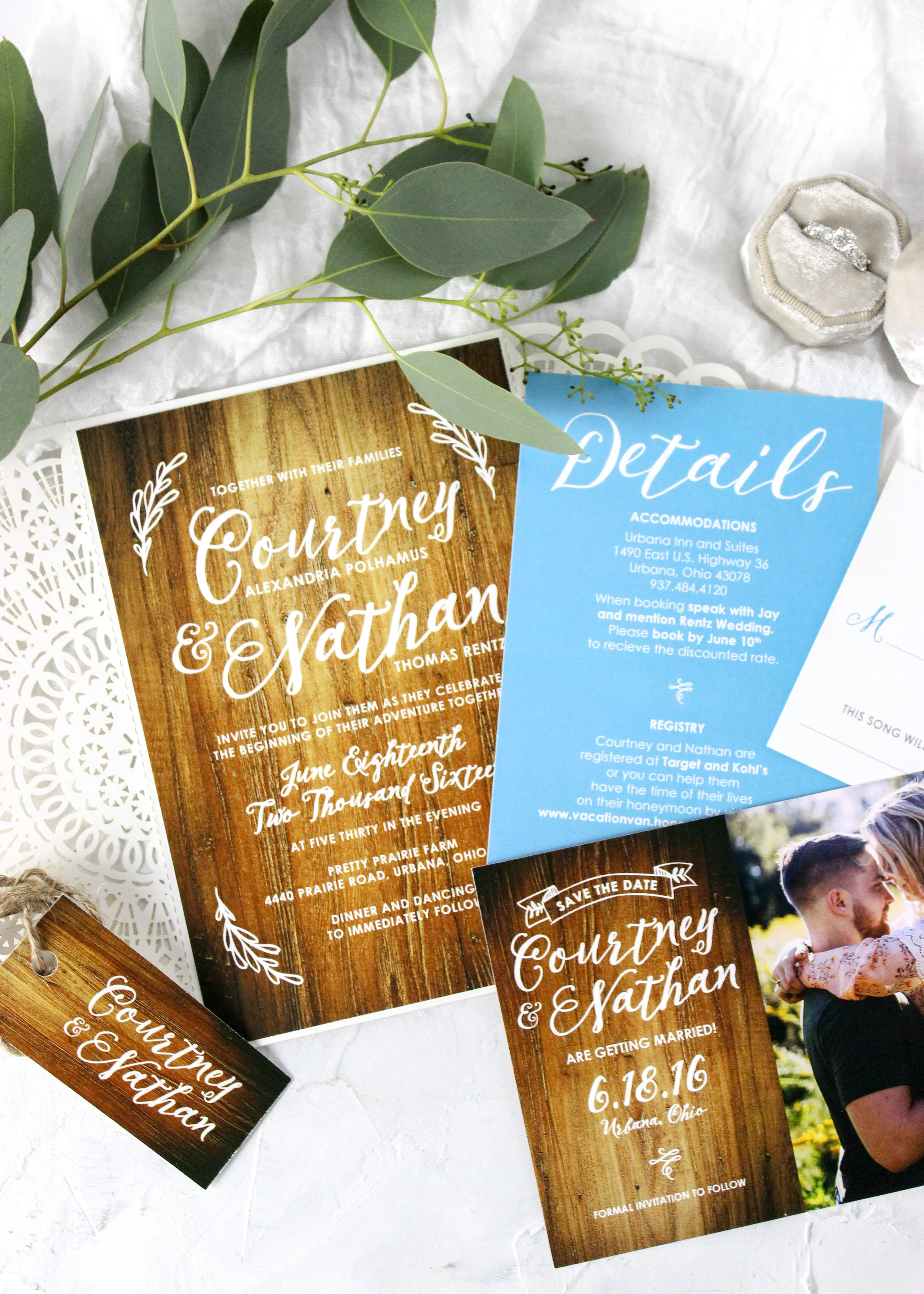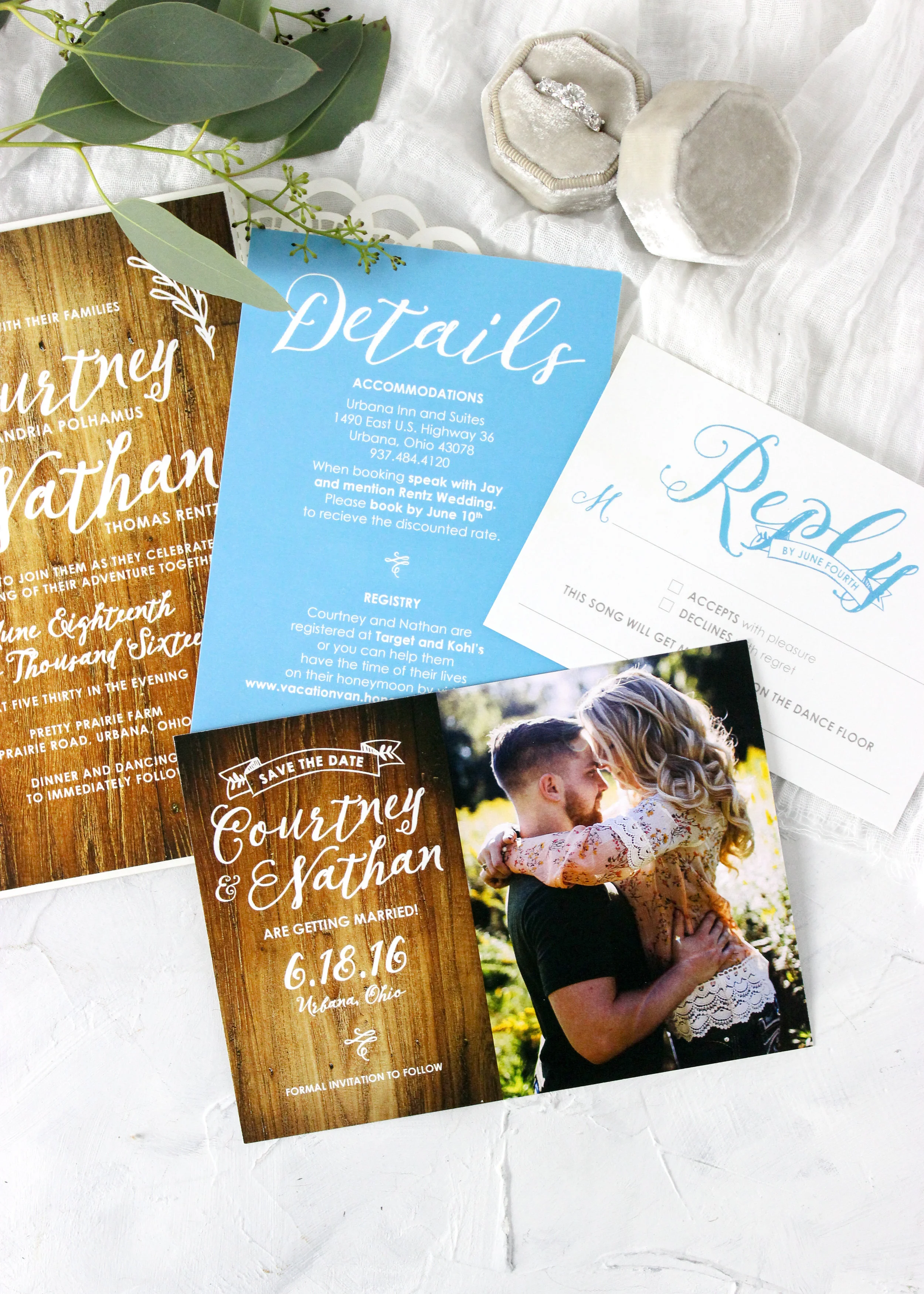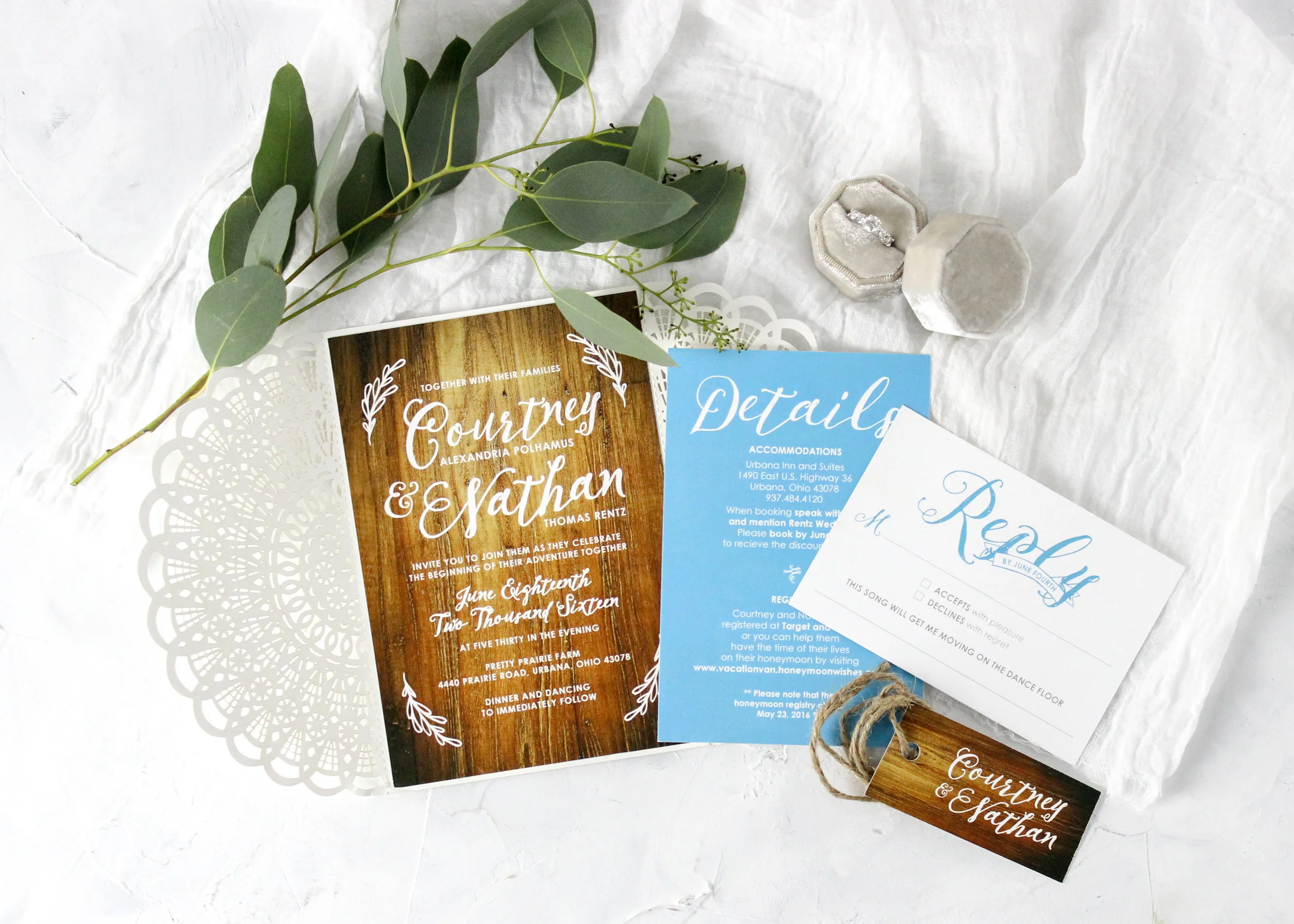 Courtney and Nathan were one of my first bookings for 2016 and I couldn't have thought of a better couple to start out the New Year! Inspired by their teal/blue mason jar decor, this lovely suite pairs a wood texture with a laser cut pocket folder, teal accents and a touch of twine to incorporate their rustic vibe. These wood inspired paper goods are definitely one of my favorites so far! It was so great working with this lovely couple and I wish them nothing but happiness on their new adventure as husband and wife!