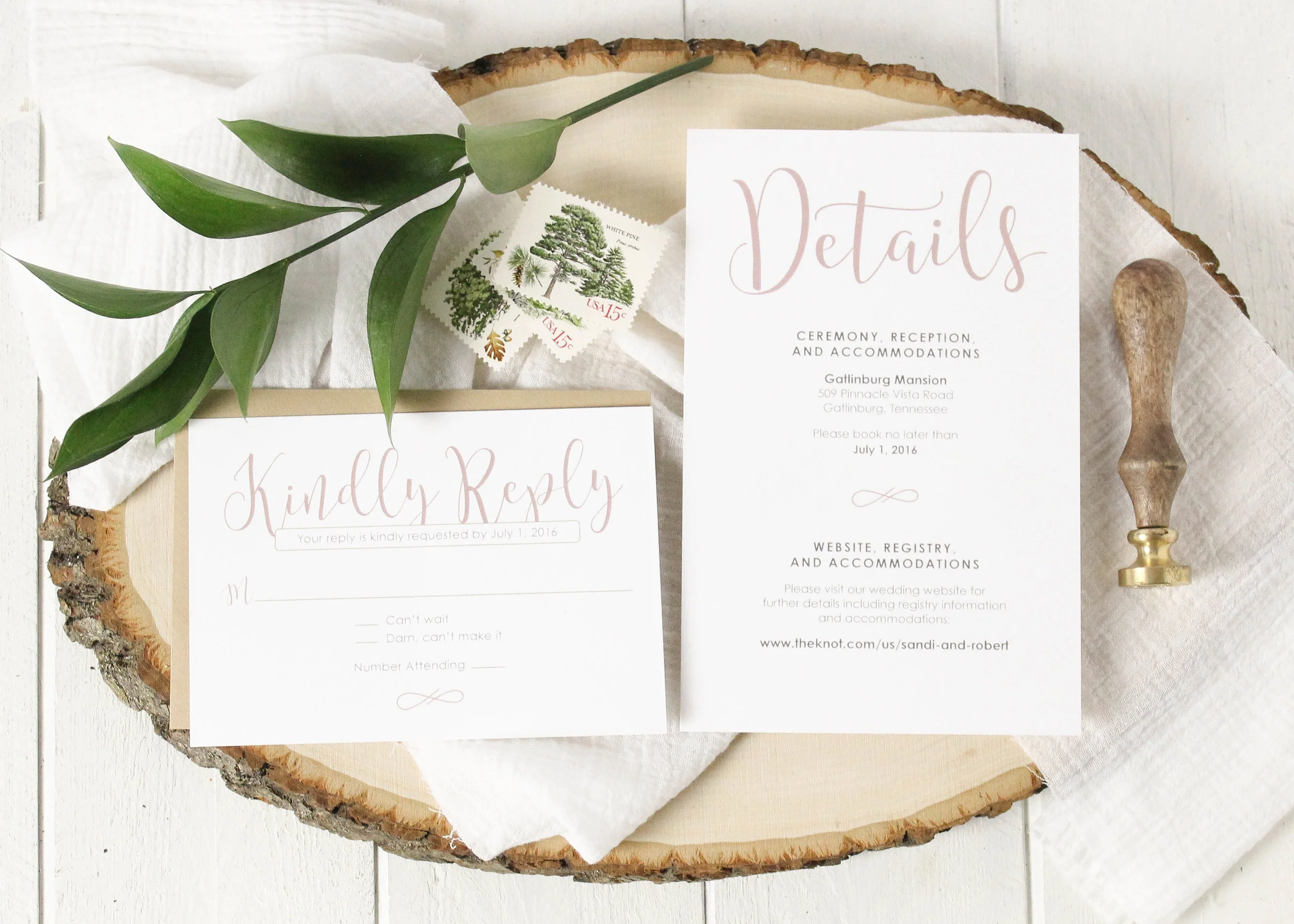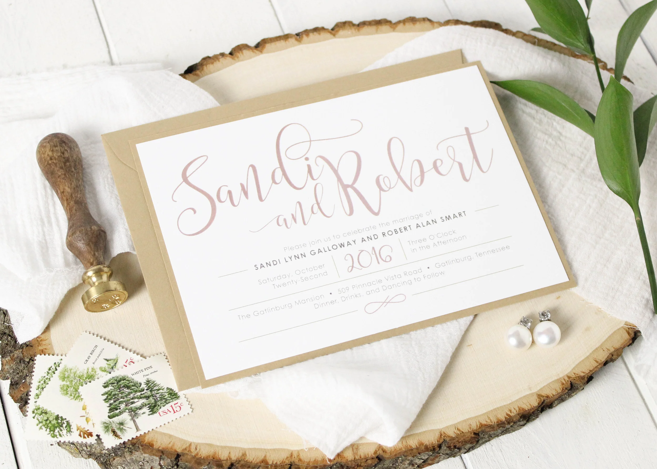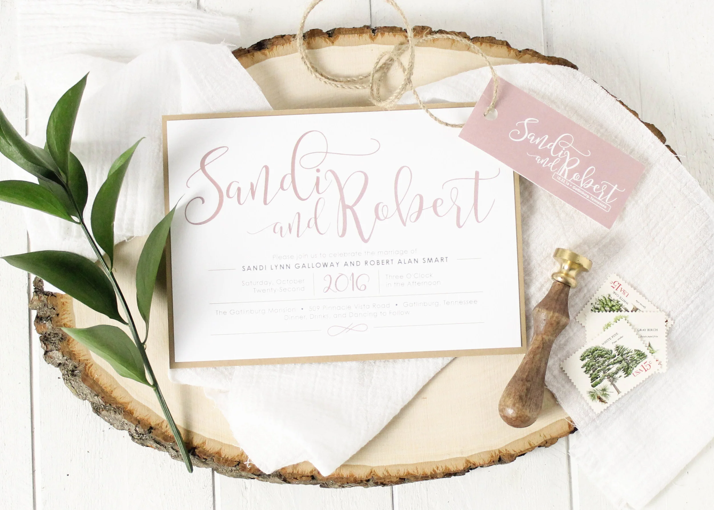 Sandi and Robert came to me wanting an invitation suite that would pair nicely with their casual affair in Gatlinburg, Tennessee. With the Smoky Mountains in mind and a blush color palette, we settled on a simple blush invitation suite with kraft backer and coordinating envelopes. And to give just a hint of a rustic vibe, we paired the monogram tag with a simple twine accent. This invitation suite was simple, casual and classic, making it the perfect pairing for this lovely couple.