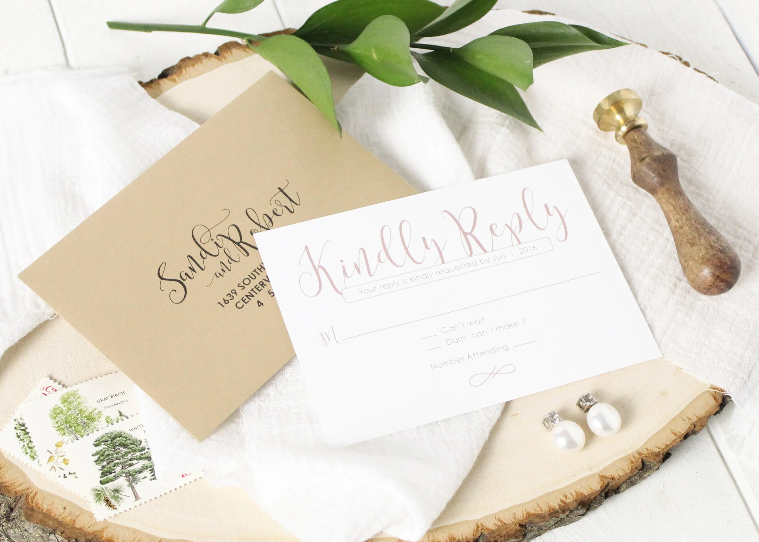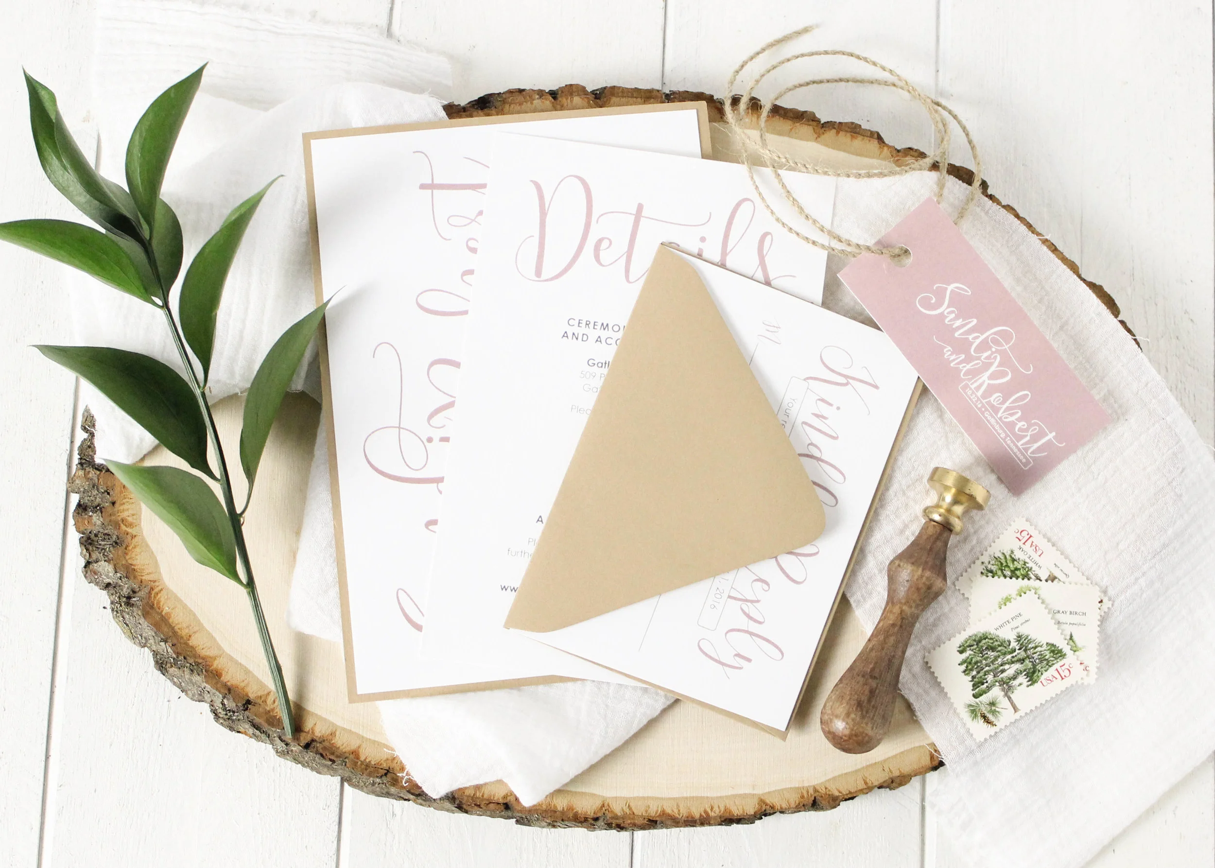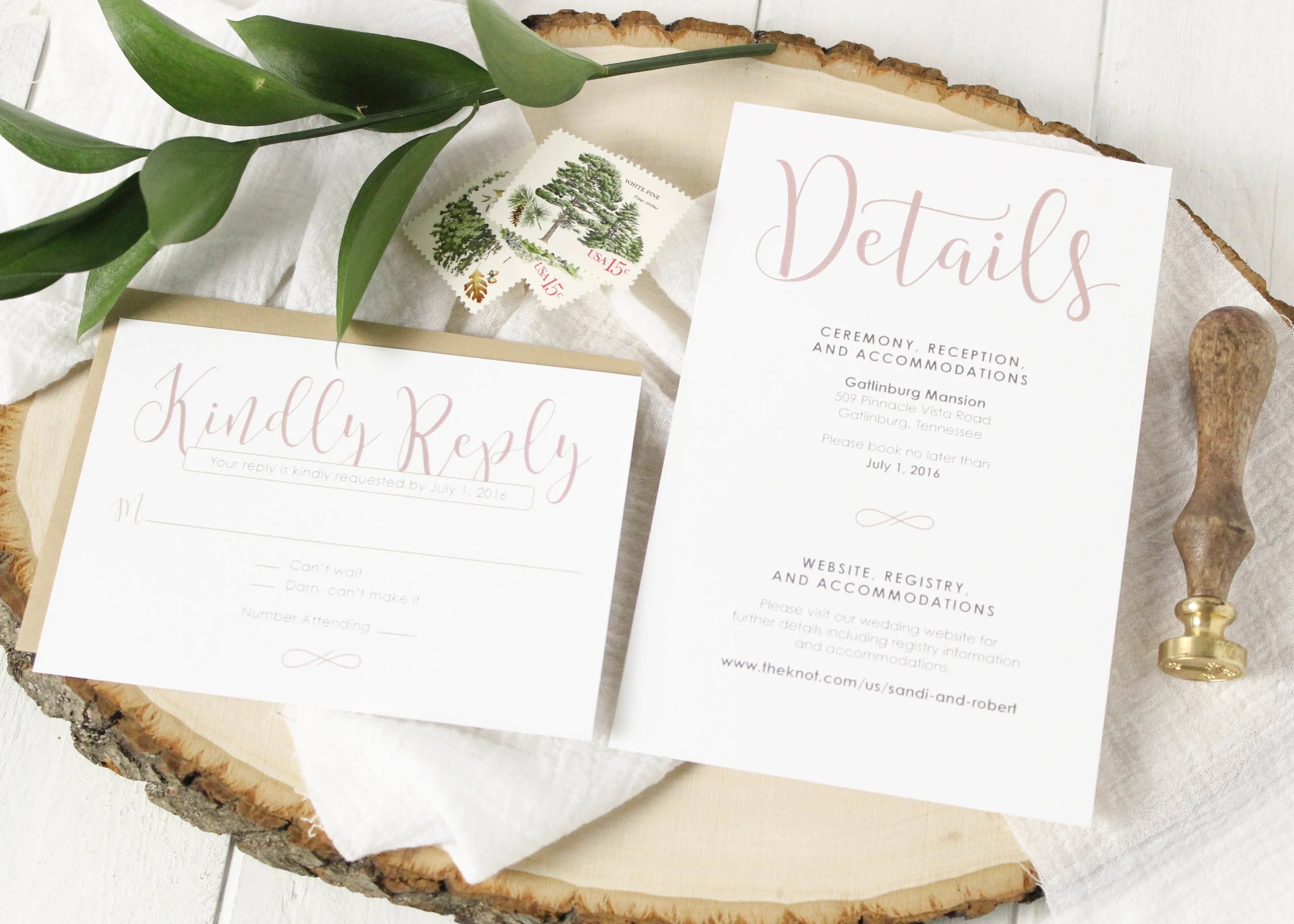 Sandi and Robert came to me wanting an invitation suite that would pair nicely with their casual affair in Gatlinburg, Tennessee. With the Smoky Mountains in mind and a blush color palette, we settled on a simple blush invitation suite with kraft backer and coordinating envelopes. And to give just a hint of a rustic vibe, we paired the monogram tag with a simple twine accent. This invitation suite was simple, casual and classic, making it the perfect pairing for this lovely couple.