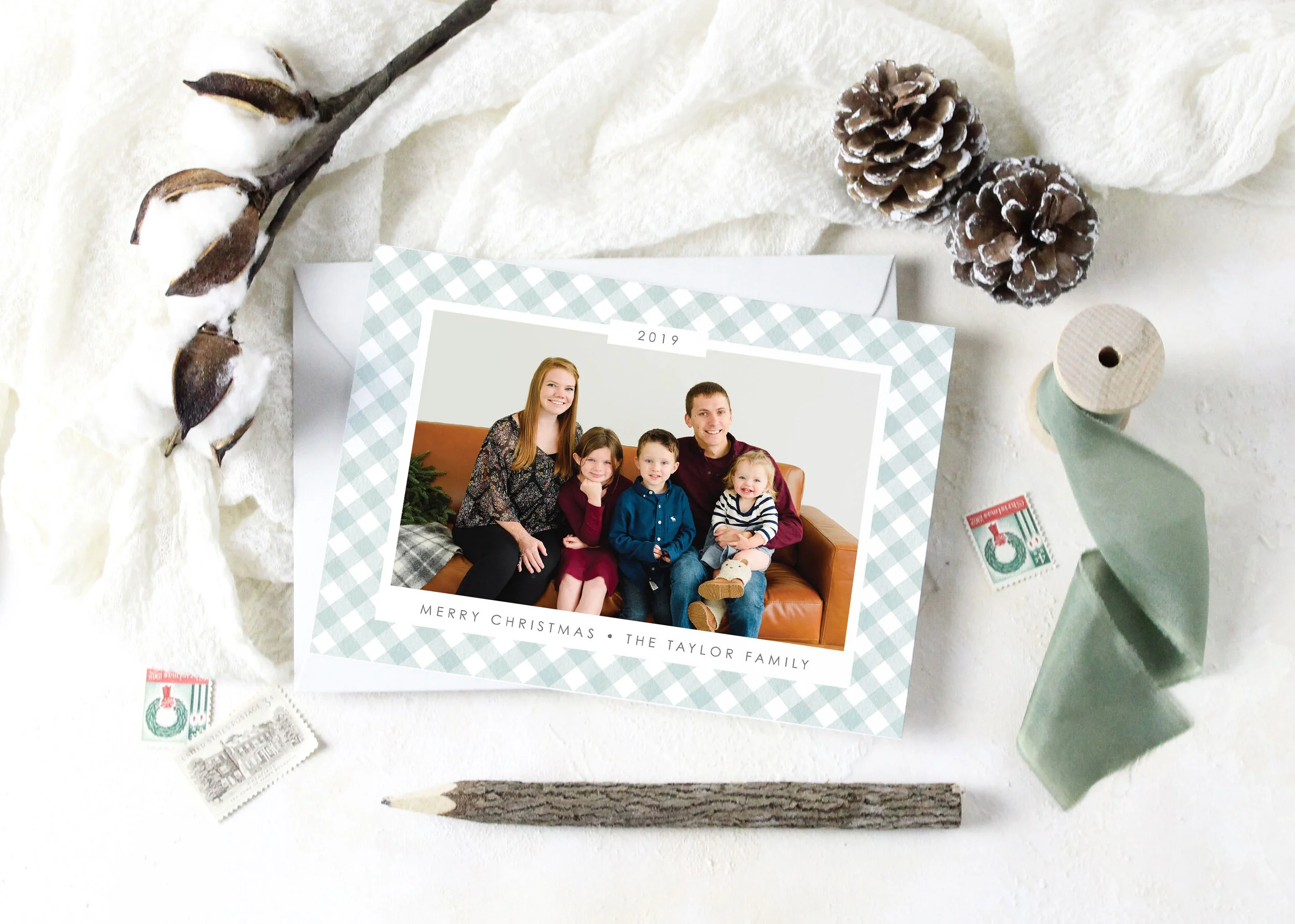 Our Modern Plaid holiday card features a neutral sage green plaid pattern that frames your family photo. On the back, you’ll be able to drop in three more vertical photos or opt for an all-over tree print. This design is perfect for showing off those kids portraits!