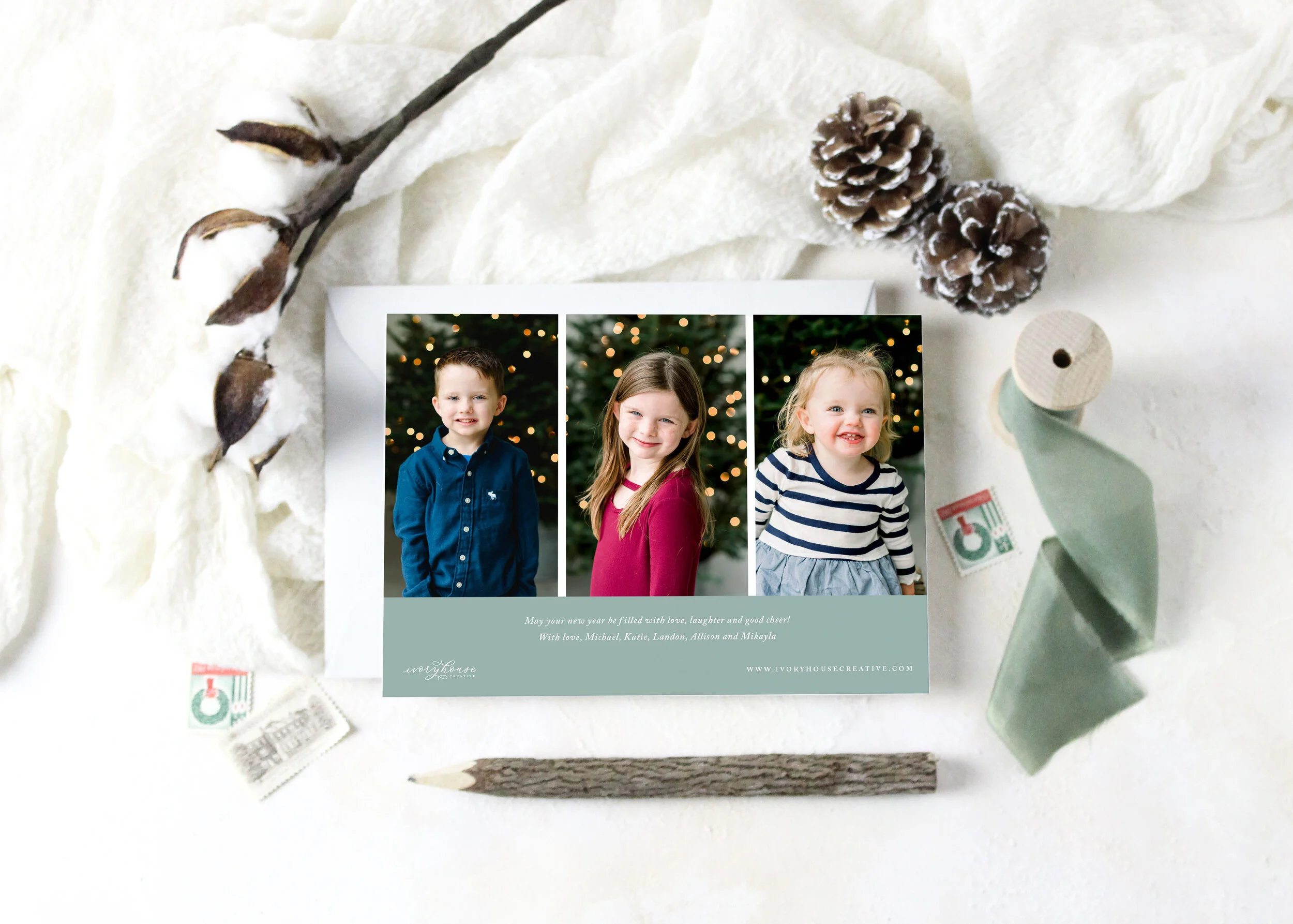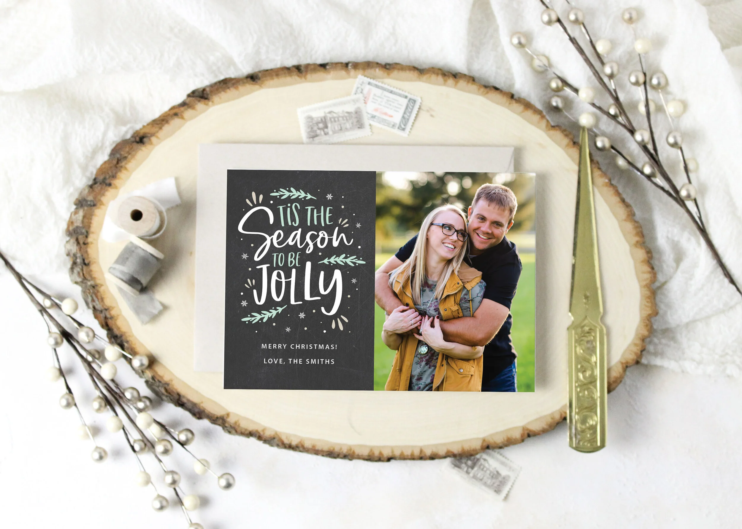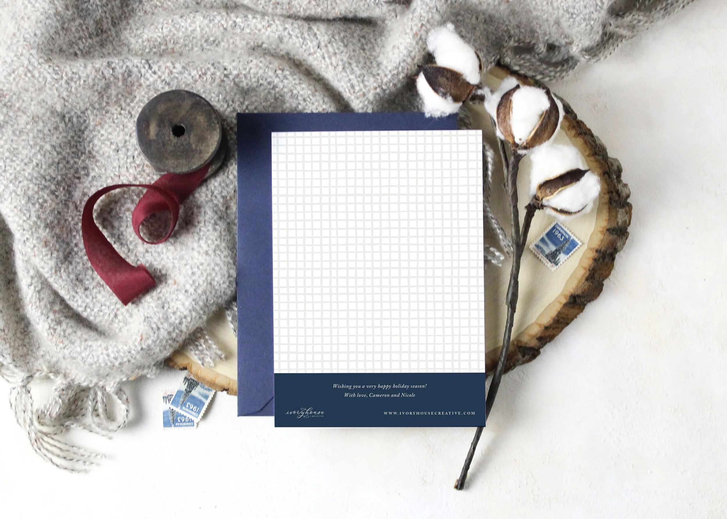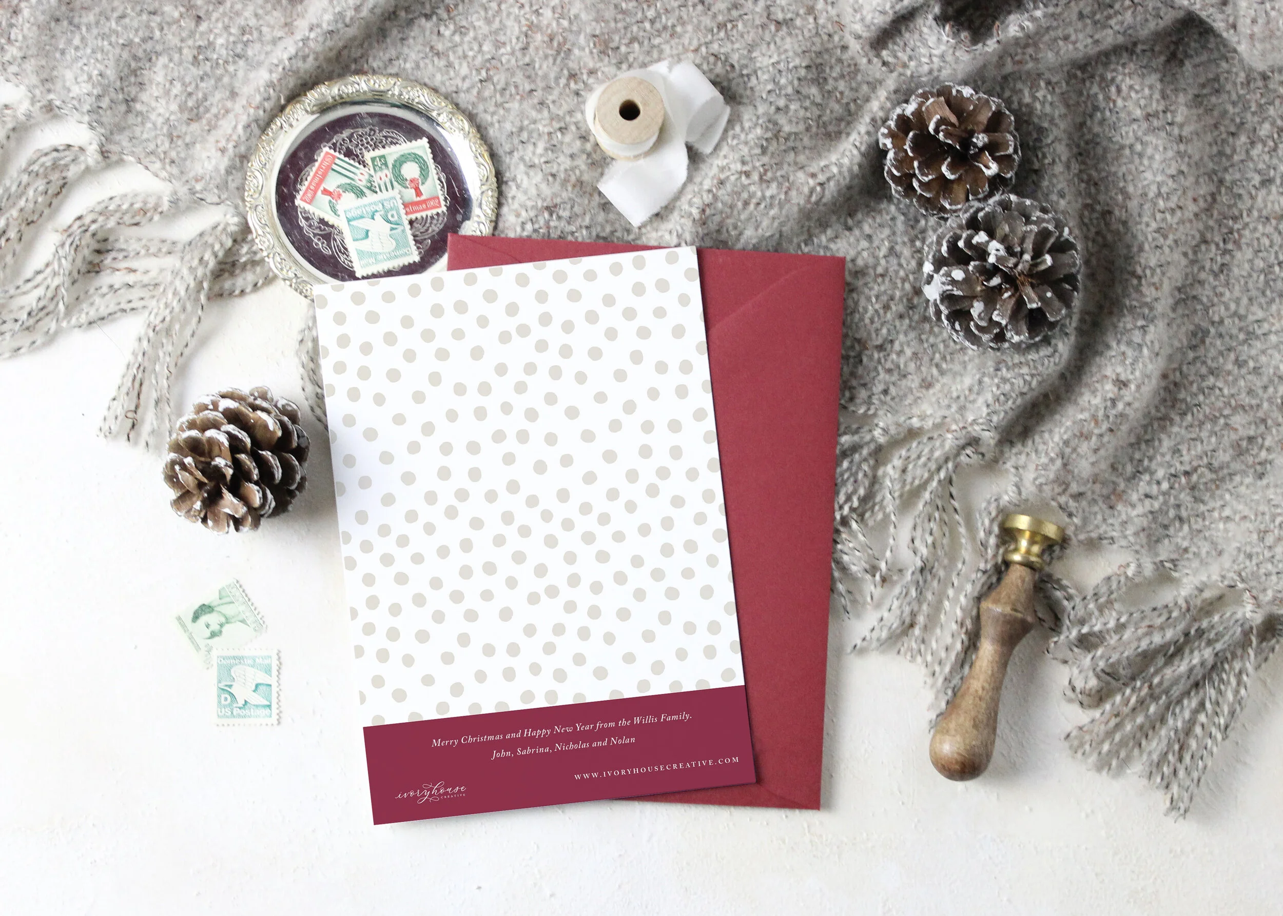 Looking for something a little more playful? The Tis This Season card has a fun script to the left of a vertical photo frame. You can add an additional horizontal image on the back in place of an all-over dotted print. Festive, fun and perfect for spreading some holiday cheer!