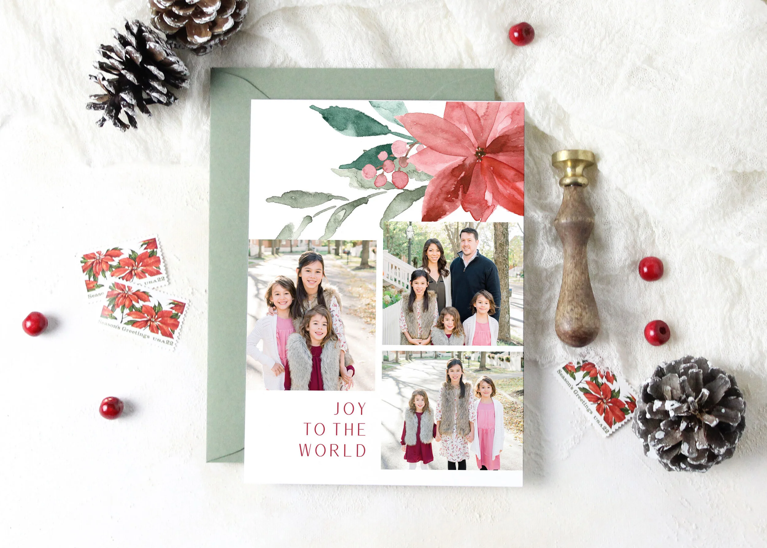 Festive poinsettias in a watercolor graphic accent this holiday card. There’s also a trio of photos accented with the jolly phrase “joy to the world.” Another great option for showing off those family photos and sending out some holiday cheer!