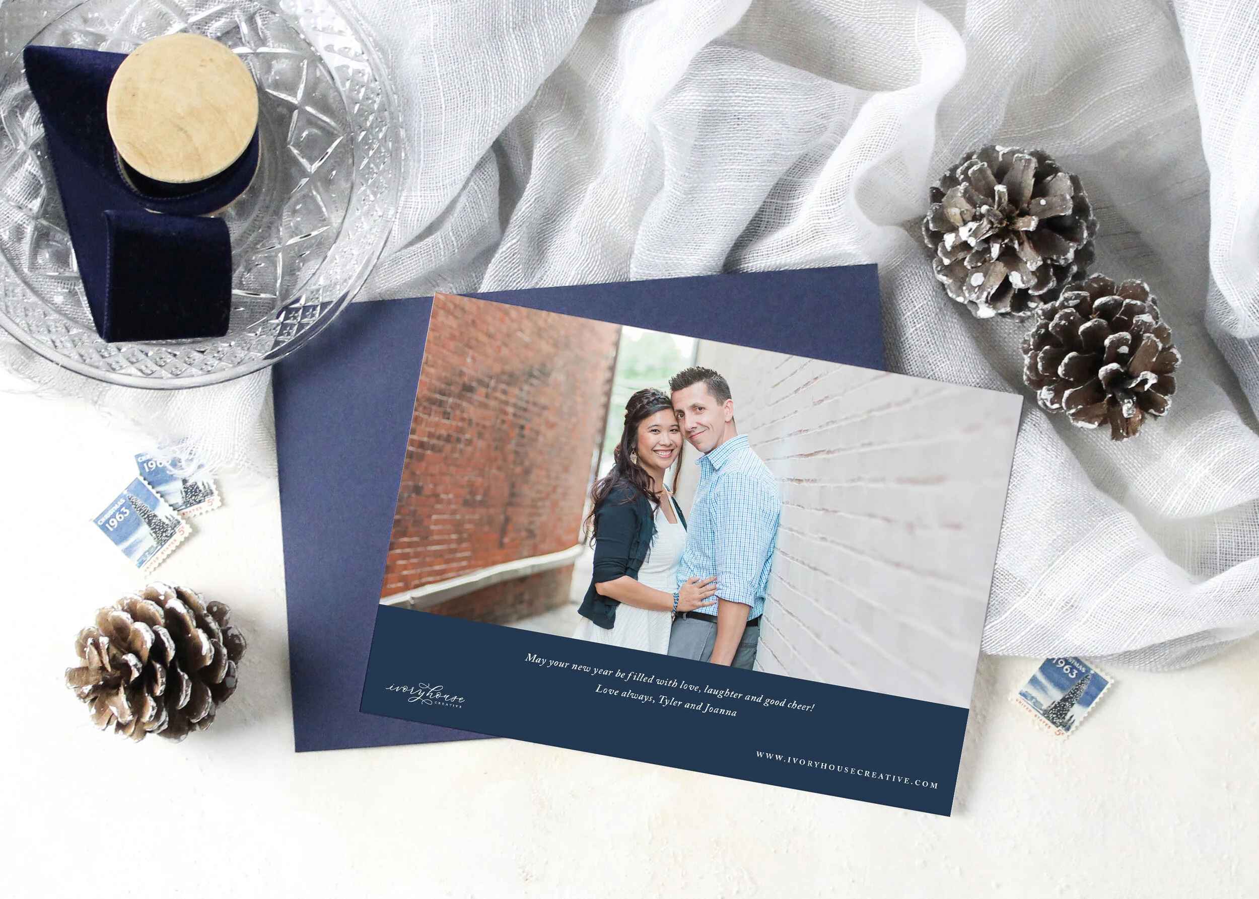 Each of these 5’’ x 7’’ designs are digitally, flat printed on your choice of white or ivory 110# paper stock. Additionally, colors and text are fully customizable. Each card has the option of a photo backer or pattern backer with your own custom message. Year in review graphics are available upon request, but may incur additional fees. Without further adieu - the new holiday card collection!