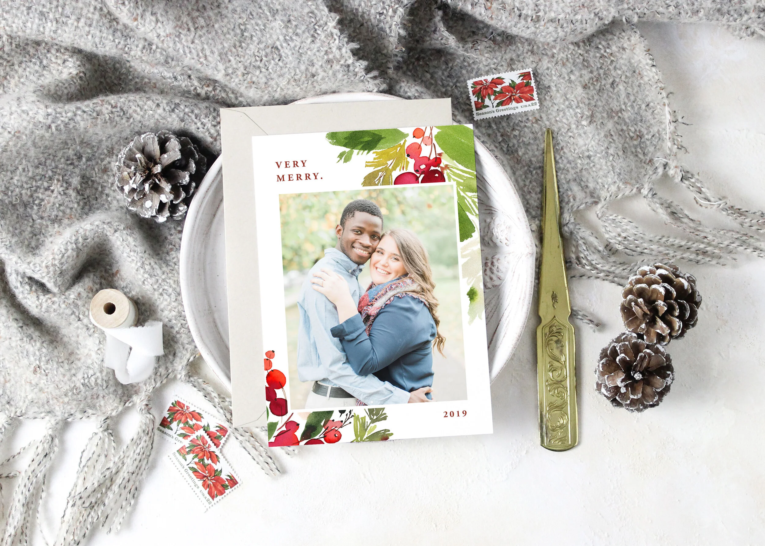 The Very Merry holiday card features a photo on the front and back for a vertical image. Festive foliage accents adorn the front photo with space for another photo and message on the back. Modern, classic and festive the Very Merry card is a great option for your greeting cards this year!