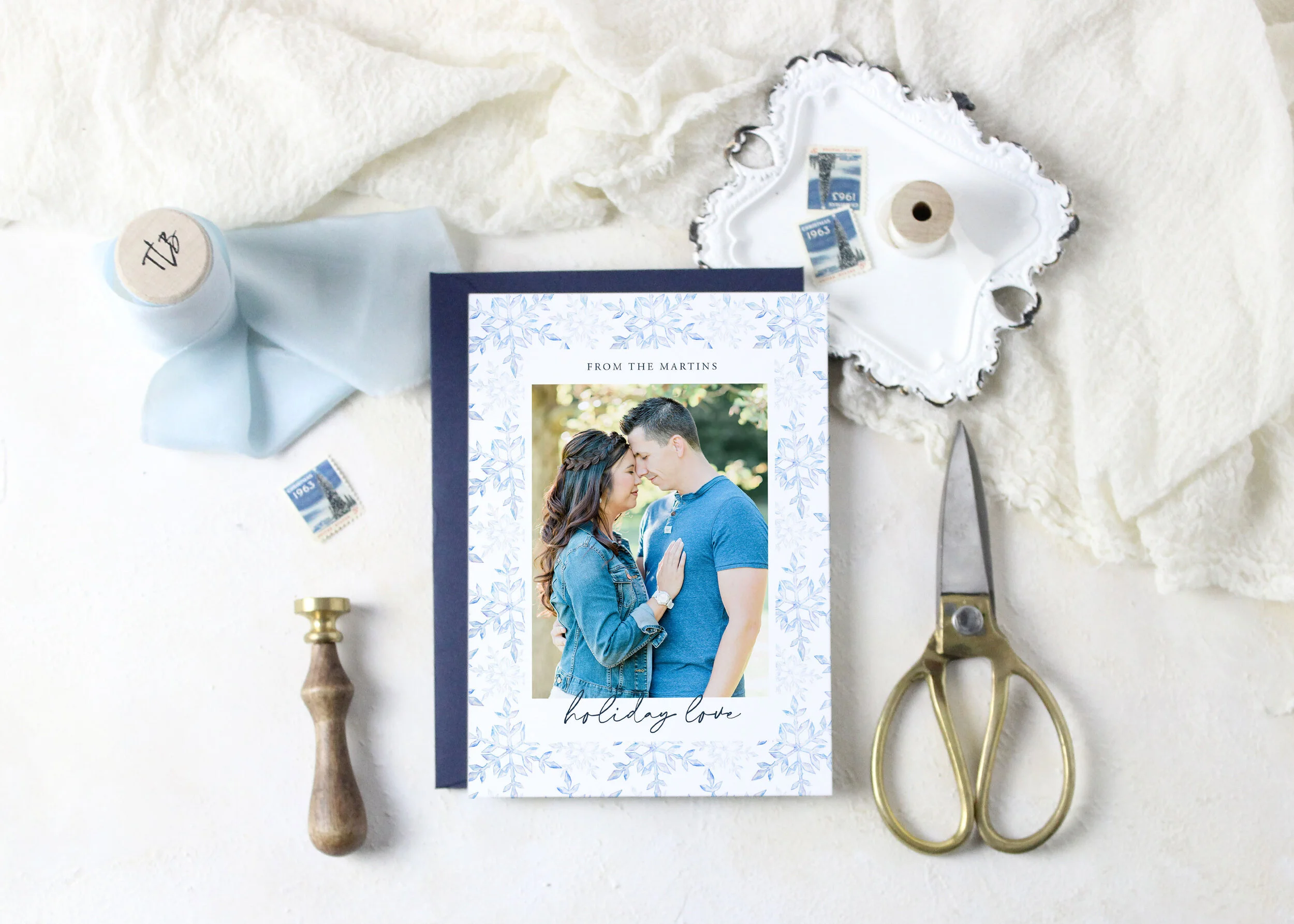 This seasonal-inspired card features blue tones and florals for a wintry look. There’s three photos on the front and one large frame on the back to share your family photos. This would also be a great alternative to share those engagement or wedding photos. For those that aren’t into so many photos, this design also comes with a floral backer option.