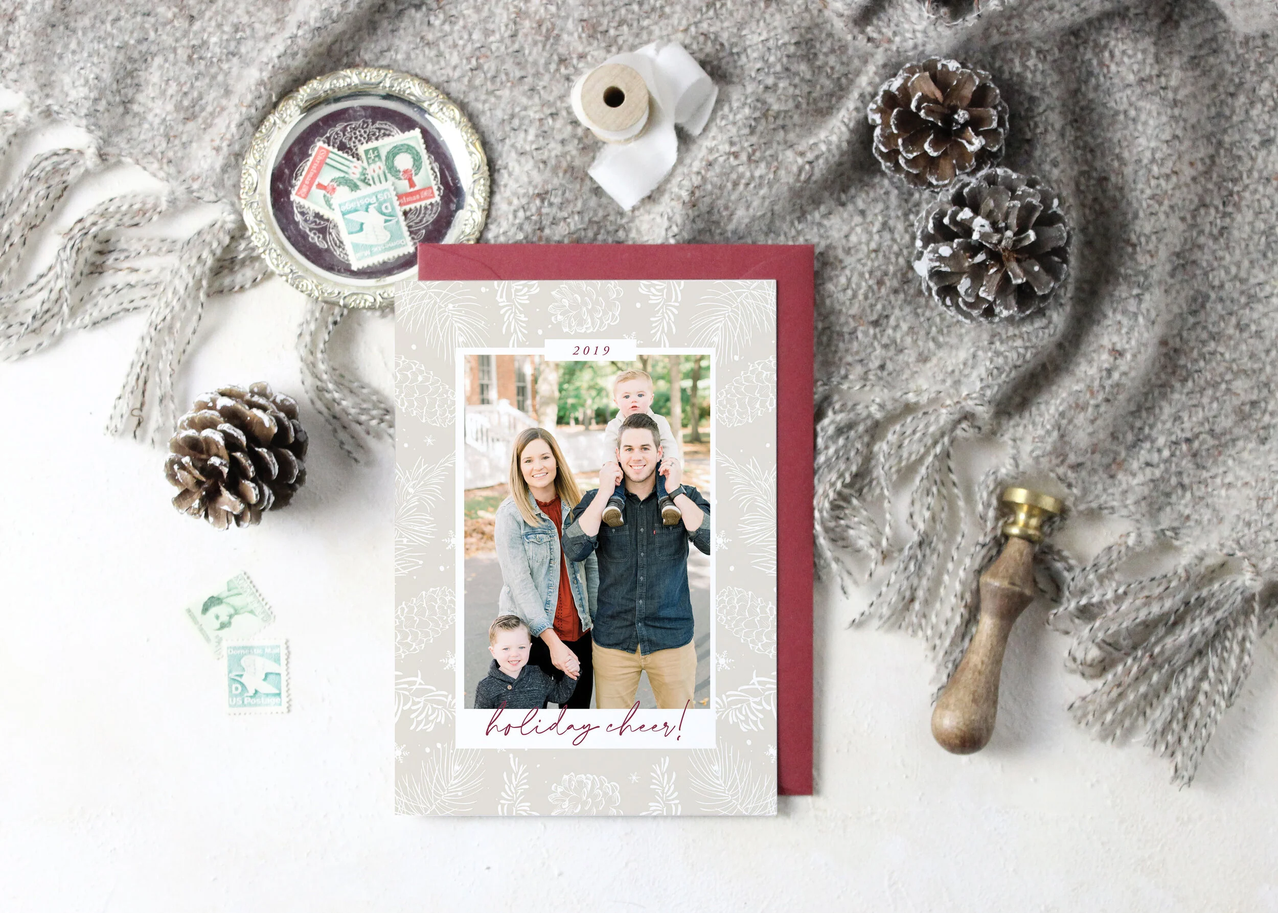 This design is simple, but cheerful. The front and back feature frames for a single vertical photo on each side. A neutral foliage illustration frames the front of the Holiday Cheer card. This classic and timeless design is a must have for your holiday card collection this year!