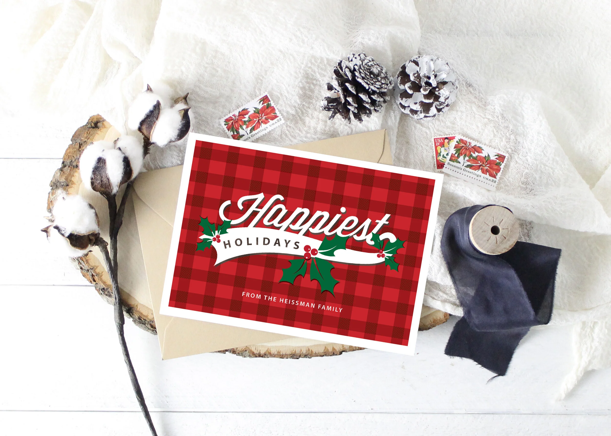 With a border of watercolor holly, this holiday card is festive without the frills. Add a horizontal image to the front of the design and back (or opt for an all-over print.) Classic, simple and a perfect addition to your holiday card collection.