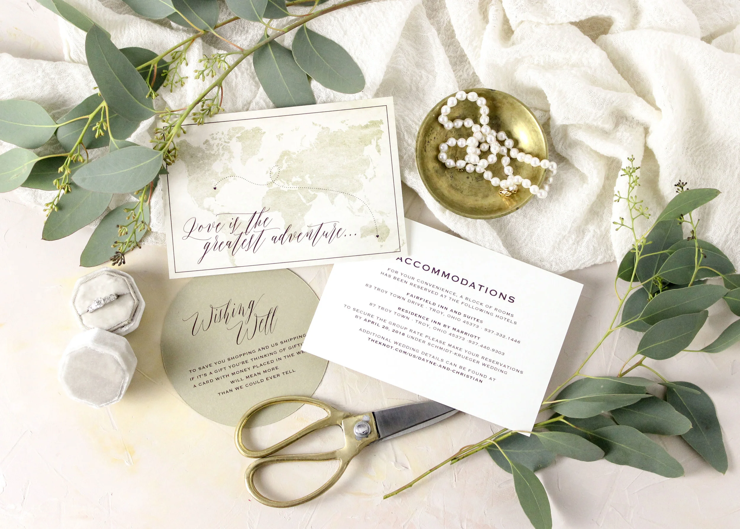 They decided on a modified version of the Rachel Suite. In order to pull the two locations together we added a map design paired with a short quote representing the distance and/or sense of adventure. In lieu of gifts, the couple opted for the Australian tradition of a wishing well card, which we commonly know as a cash registry. We also added envelope liners, addressing and upgraded the invitation to a double-thick paper stock for a luxurious look and feel. Lastly, they opted for an online reply card due to the hindrances of international postage.