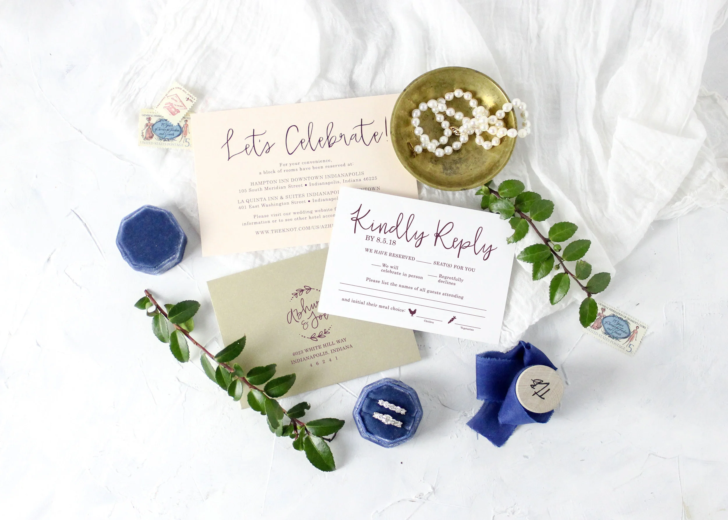 To make things easier during the design process, I sent paper samples to help her narrow down her choices. Joe and Azhuree selected neutral tones for the paper stock, featuring white, gold and a pale blush tone; allowing the burgundy text to really pop.