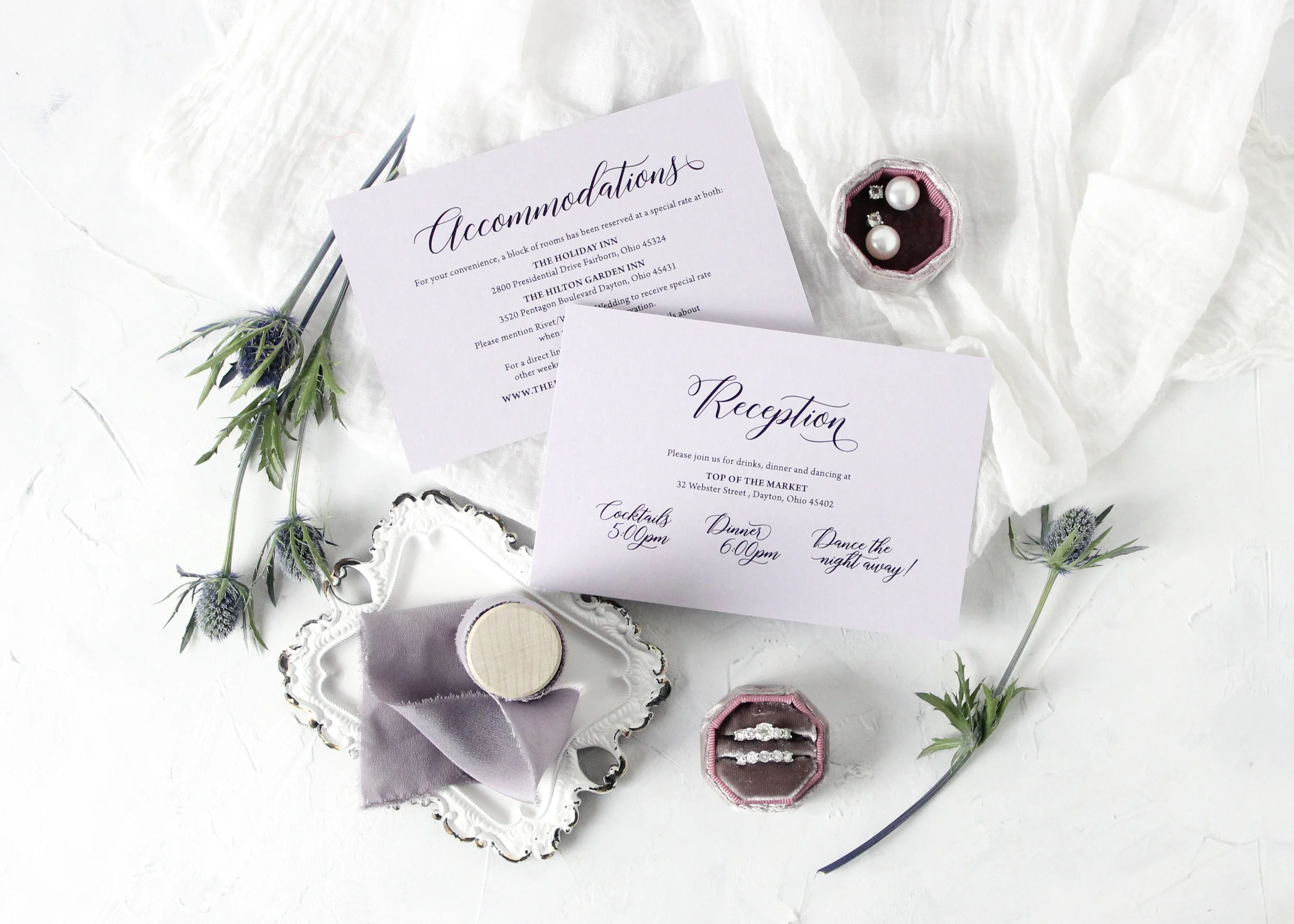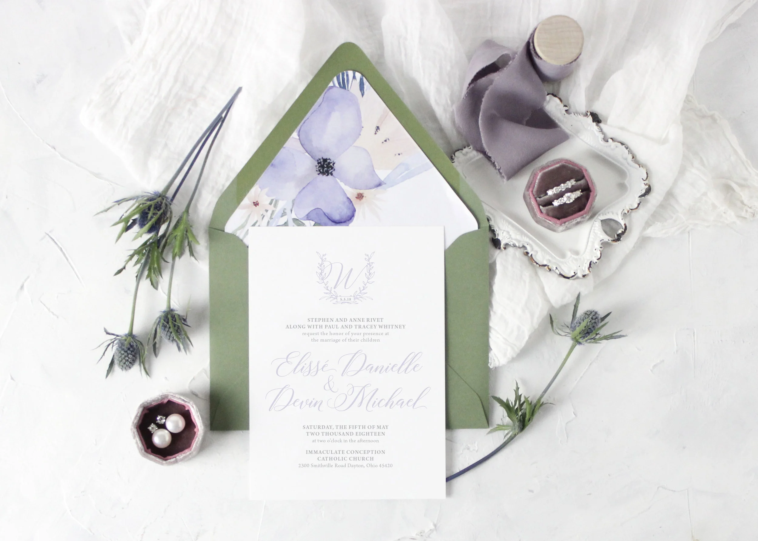 Today’s featured couple are Elisse and Devin, Dayton locals whom were married in a whimsical ceremony last spring. Their reception took place at the Top of the Market, one of the best industrial-chic venues in the Gem City. Their color palette featured soft hues of lavender and sage, which was used to create one of our most inspo-worthy invitation suites to date.