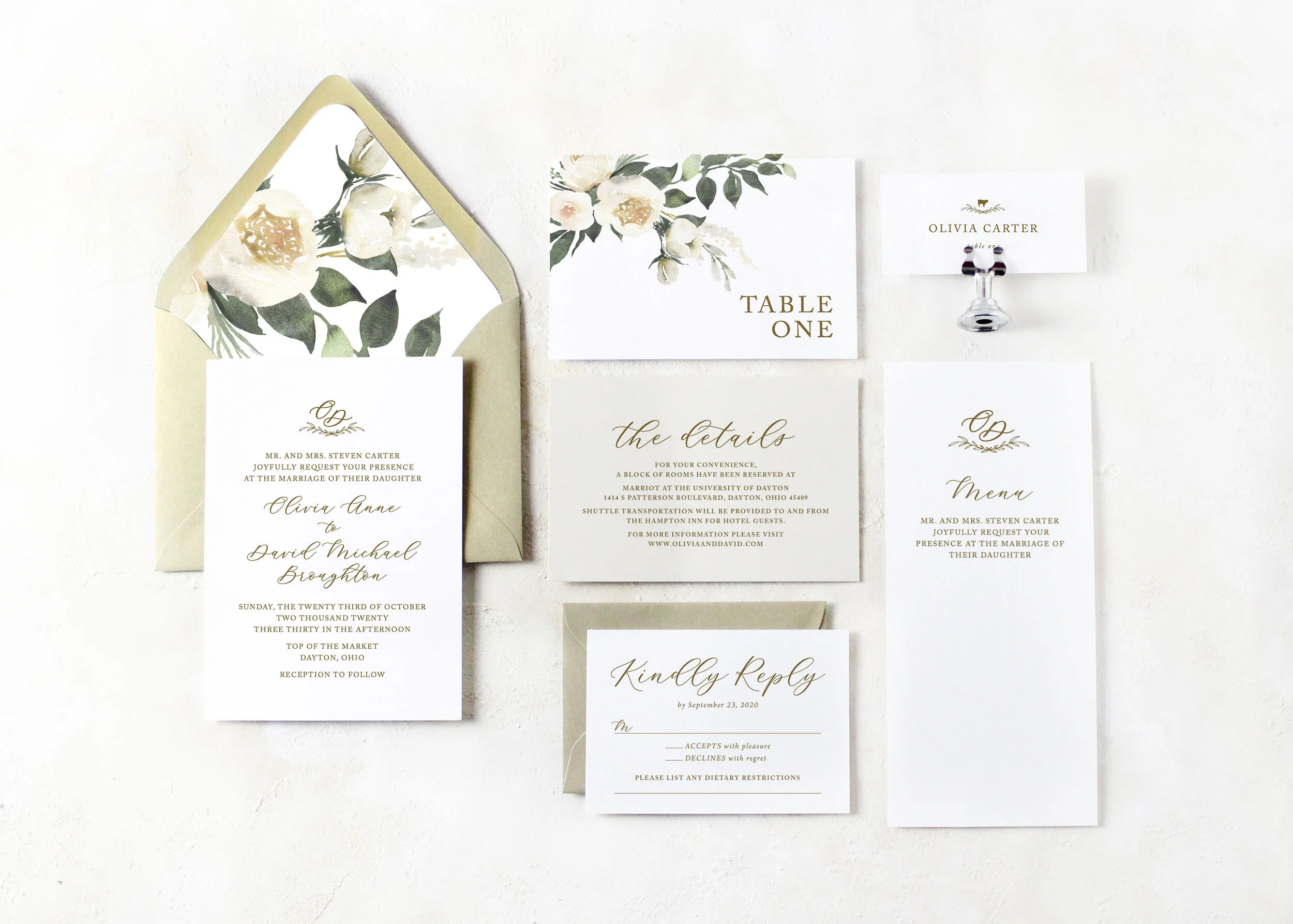 Our new collection styles range from soft floral accents to elegant waifs of filigree. For couples who want simple, classic or seasonal inspired design, we’ve got that covered too. This collection was really inspired by florals and monograms. I wanted to create softer, classic designs that would be super versatile for any color palette, style or couple. I think my personal favorite is the Olivia Suite. It offers both monogram and floral accents, while maintaining a soft neutral tone that is perfect for just about anyone.