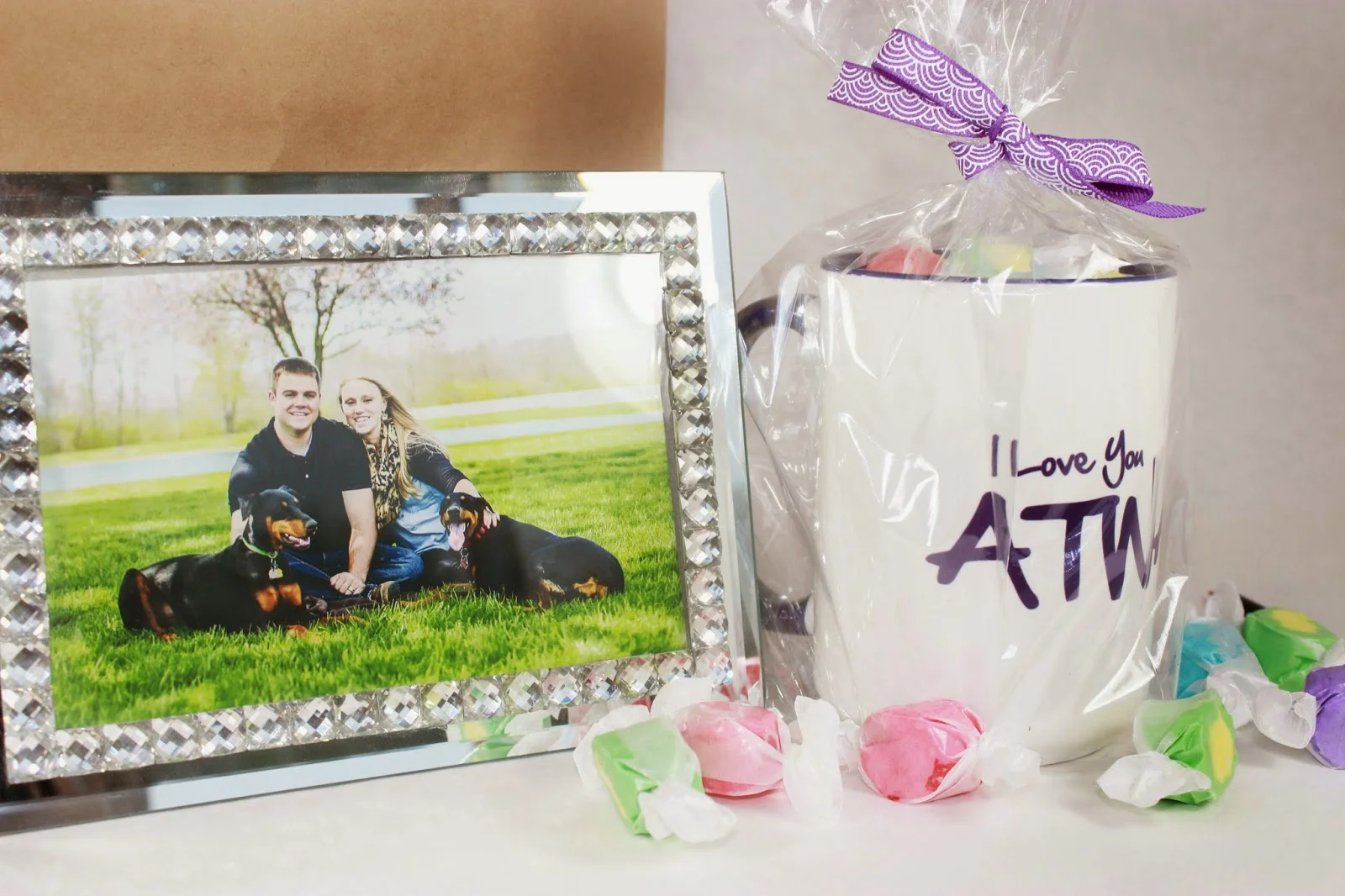 Each mug, except my grandmother's is filled with a small floral arrangement from the local florist. Since I had to ship my grandmother's mug to Florida, I thought that it would be better to accent her mug with one of her favorite candies, Salt Water Taffy.